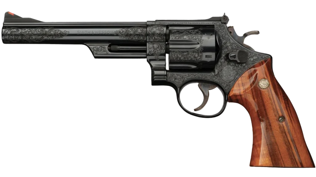 - The elegant floral scroll engraving covers almost every exposed surface (frame, cylinder, barrel) giving the revolver visual depth and artistry.