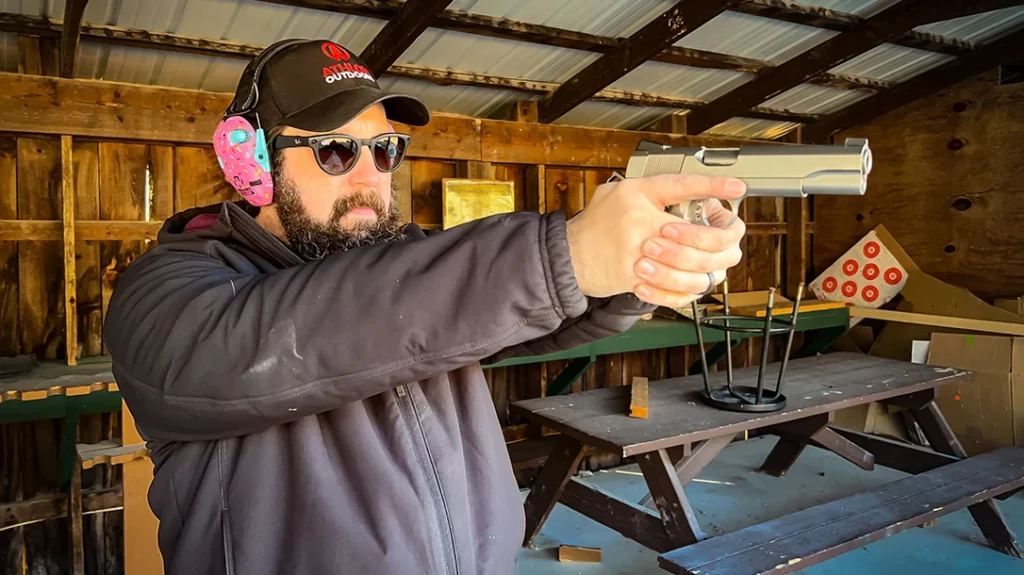 The pistol weighs 41 ounces. The trigger, measured on my Lyman gauge, breaks at 4.1 pounds. That is heavier than most competition 1911 triggers, but it is crisp, clean, and predictable. I had no trouble shooting it at 82 yards.