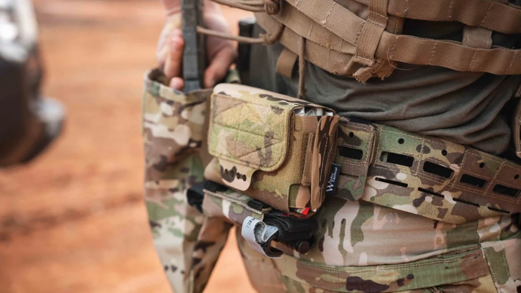 For right-handed shooters, mount your handgun holster on the strong (right) side and magazine pouches on the support (left) side. Reverse this for left-handers. On the magazine side, start with pistol magazines first (they’re shorter and allow better range of motion when bending or under a plate carrier), followed by rifle magazines. A common layout is two pistol mags followed by one or two rifle mags.