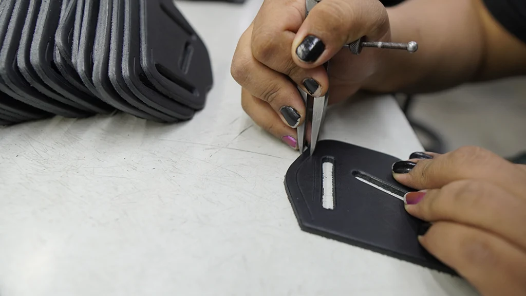 For precision cuts 1791 craftsmen use steel dies and a hydraulic clicker press that neatly cuts out the pattern. After this the leather edges are beveled, and the stitch line is scribed giving the sewing machine operators a guide. The 1791 logo is embossed on the back of the holster at this point.