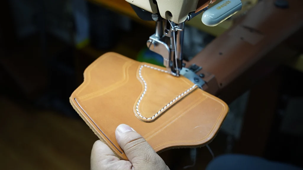 1791 uses industrial grade saddle stitch machines designed to easily punch through stiff and thick leather. Once sewn, the holsters belt loops are cut through the two layers of leather using a long-handled press with an oval cutting die. At this point the holster is given a quality control inspection, and loose threads are trimmed with an electric hand tool that melts the excess thread giving it a neat and clean appearance. Edges are then cleaned up and burnished with rotary tools.